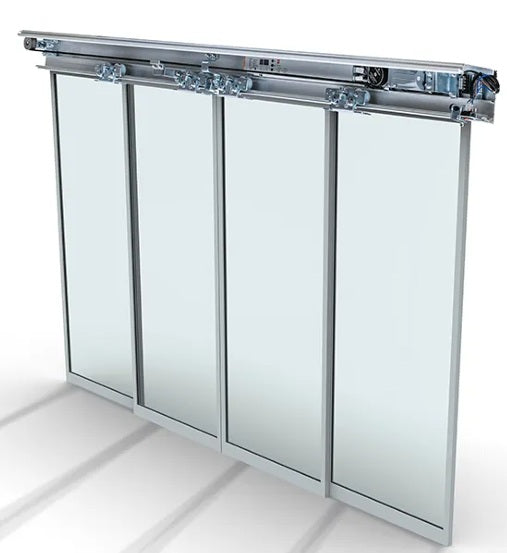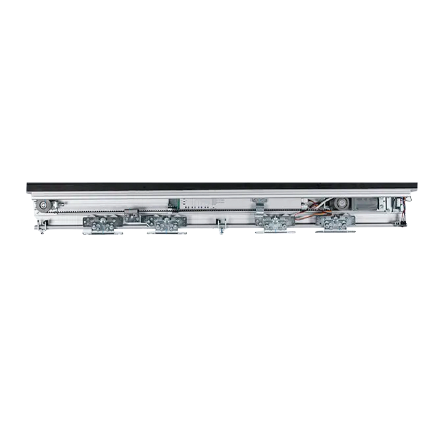 Cabezal para puerta automática corrediza, velocidad de apertura y cierre regulable con potencia 80w. Incluye cuatro pares de fotoceldas para mayor seguridad y dos controles manuales para su programación y activación. Carga dos hojas de 120 kg. Incluye caja electrónica con motor, computadora, banda dentada, dos sensores, dos pares de carros y perfil tapa.